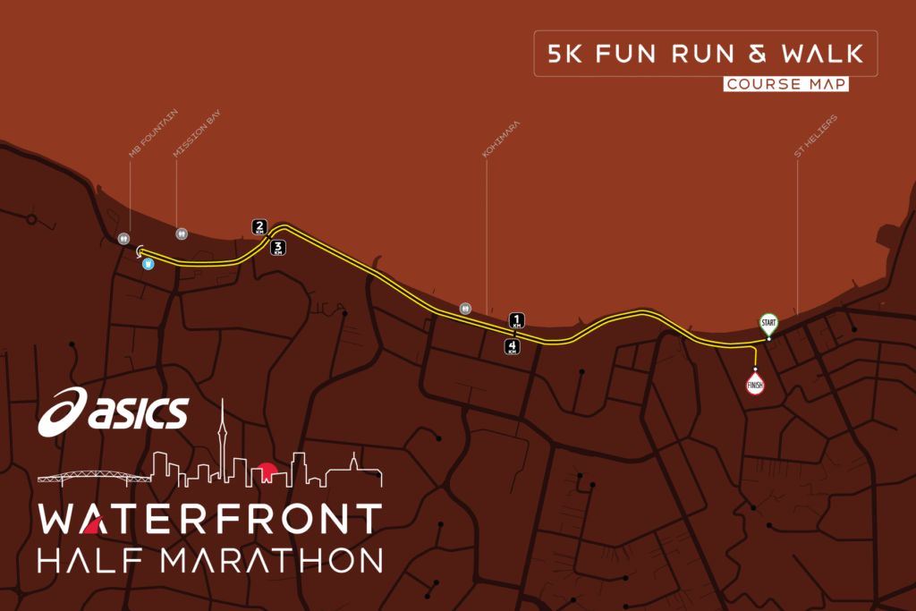 From St Heliers, follow Tamaki Drive past Kohimarama, Mission Bay and Okahu Bay. The turnaround point is right outside Ferg's Kayaks on the city side of Okahu Bay. After the turnaround, head straight back on Tamaki Drive to the finish line on Vellenoweth Green, St Heliers.